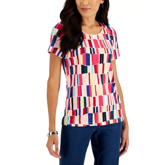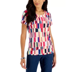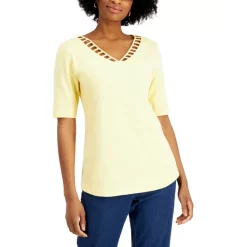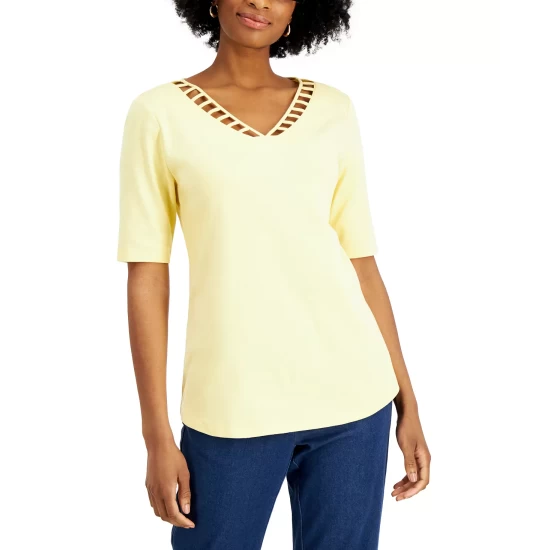 Upgrade your stylish staples when it comes to classic solid tees with this elbow length sleeve, cutout V-neck top from Karen Scott.