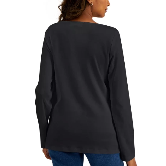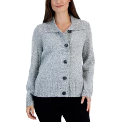 Thick knit fabric keeps you cozy while oversized buttons draw attention up towards your face with this petite cardigan from Karen Scott.