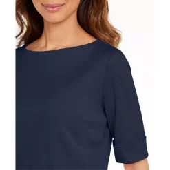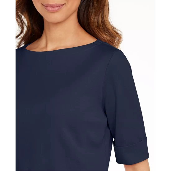 Simple and flattering, this petite T-shirt from Karen Scott is styled with a boat neckline and cuffed elbow-length sleeves for a classic look.