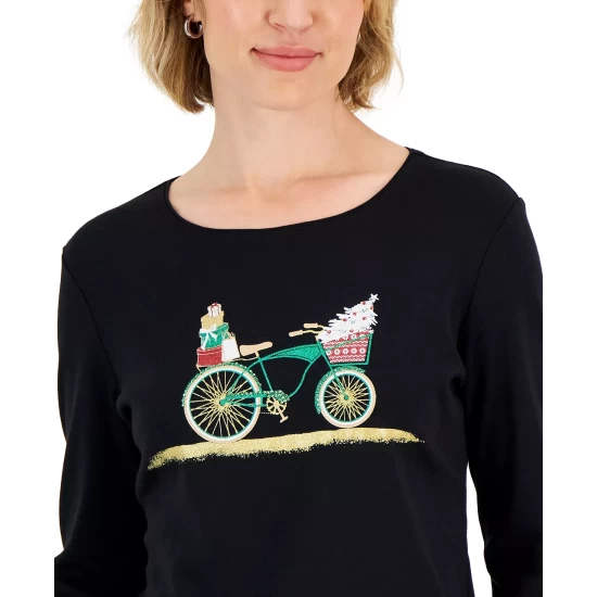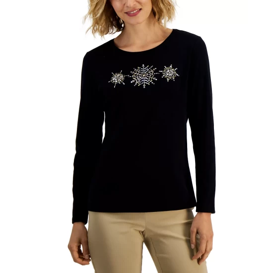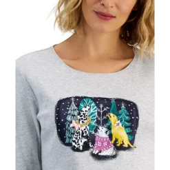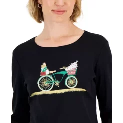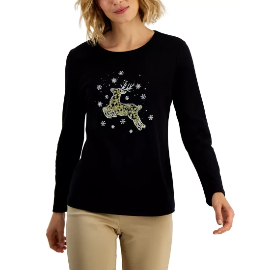 Ugly holiday sweaters are a thing of the past. This long-sleeve petite T-shirt from Karen Scott proves you can still be festive and look good all through the season, featuring an uplifting graphic that’s as refreshing as it is comfy.