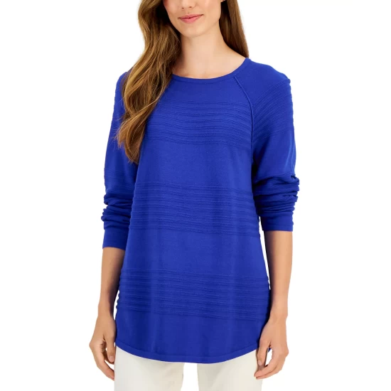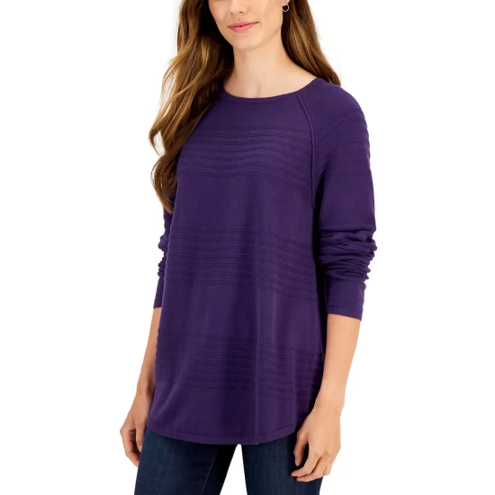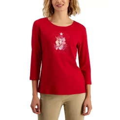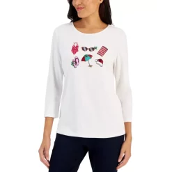 Get ready for the holidays with these whimsical printed designs that take center stage on this petite 3/4-sleeve top from Karen Scott.