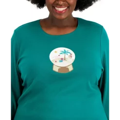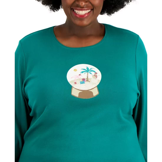 A tropical holiday motif shines from a snow globe on this festive plus size top by Karen Scott.
