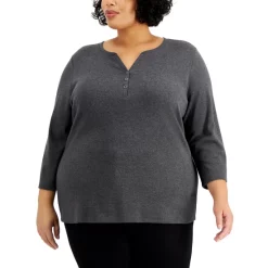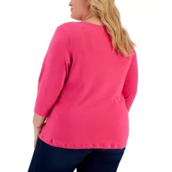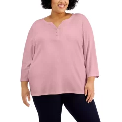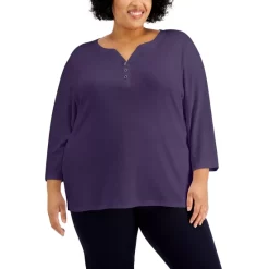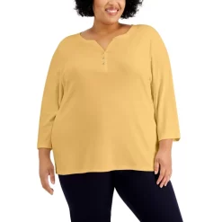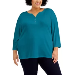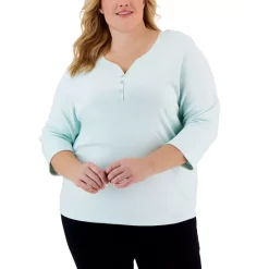 Karen Scott refreshes your wardrobe by upgrading a stylish staple with this plus size 3/4-sleeve Henley top.