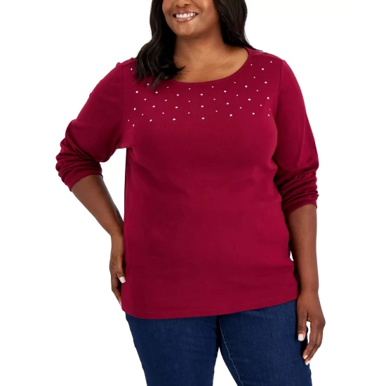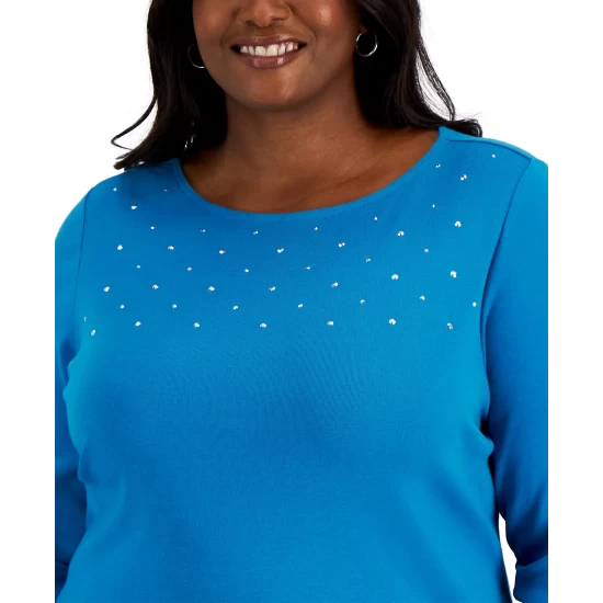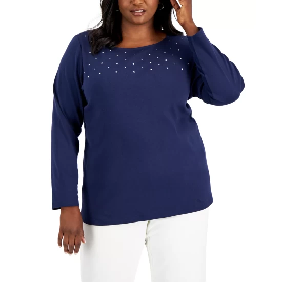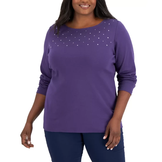 Karen Scott’s plus size cotton top comes alive with shimmery stud embellishments along the front.