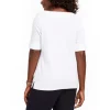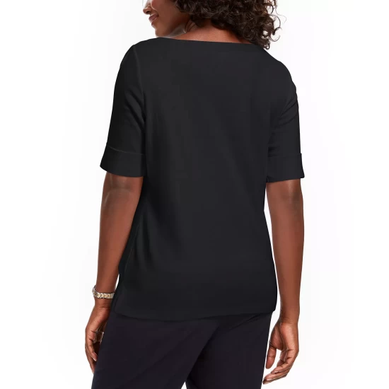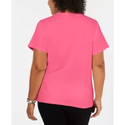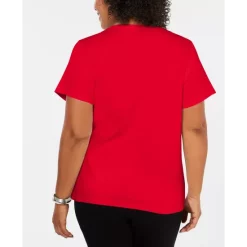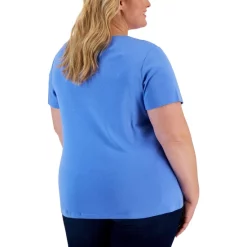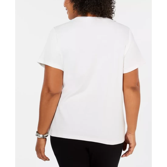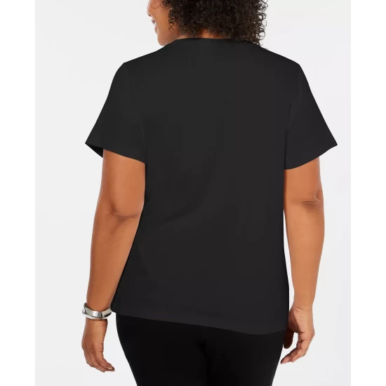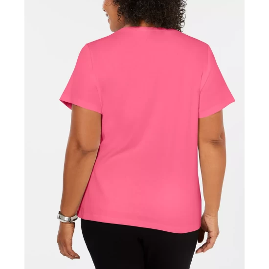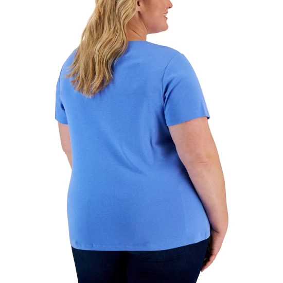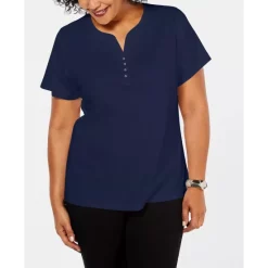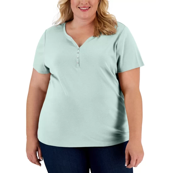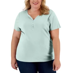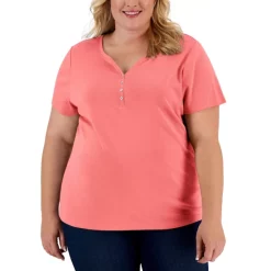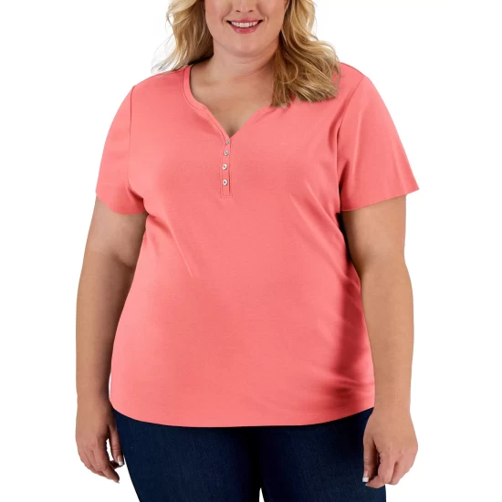 Karen Scott’s plus size short sleeve top is a casual collection essential, styled with a flattering henley neckline in a comfy cotton knit.