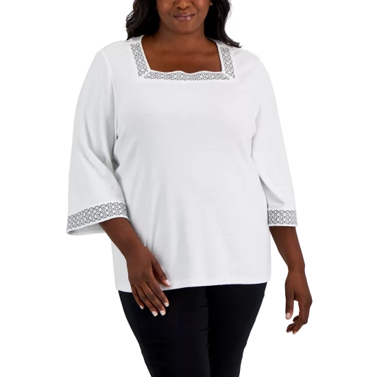 Karen Scott’s plus size top dazzles with a unique square neckline, embroidered details and sparkling studs.