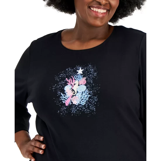 A bright and beautiful seahorse graphic sets the tone for fun days with this plus size top by Karen Scott.