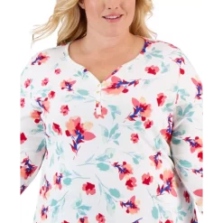 A vibrant floral print and charming 3/4-sleeves come together for a playful look on this plus size Henley top from Karen Scott.