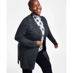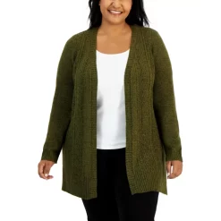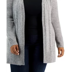 Layer with style in Karen Scott’s plus size cardigan, detailed with cable-knit accents and an open front.