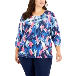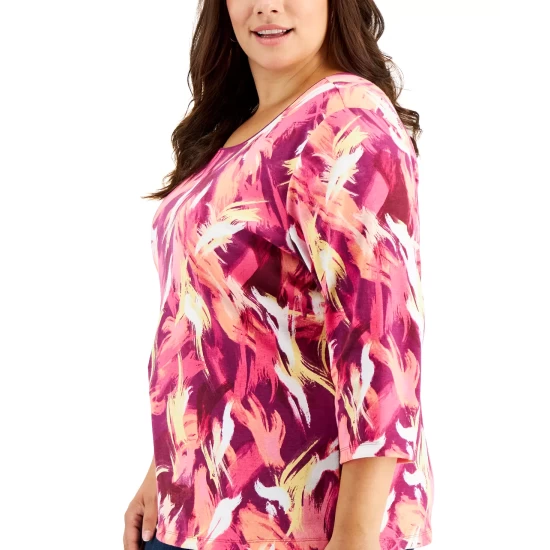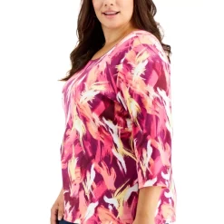 Brighten your wardrobe with this plus size 3/4-sleeve scoop-neck top from Karen Scott, featuring an artistic inspired print.