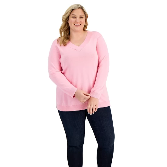 Get ready to stay cozy in chic style this season with Karen Scott’s V-neck plus size sweater.