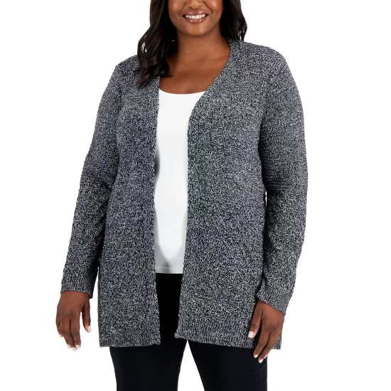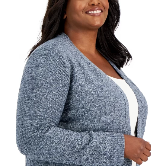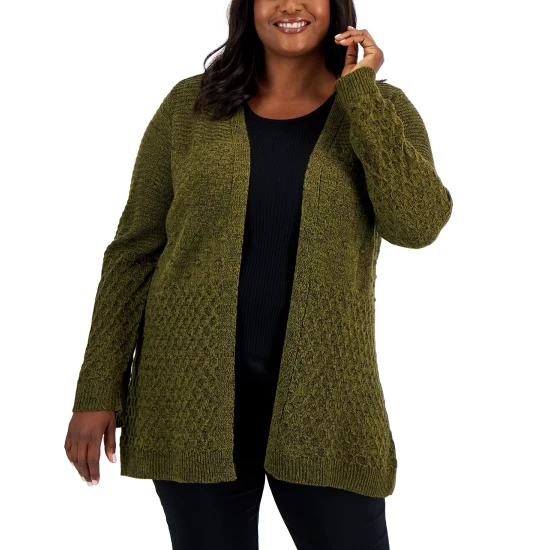 A beautifully textured layer from Karen Scott, this plus size cardigan features an open front that’s perfect for layering.