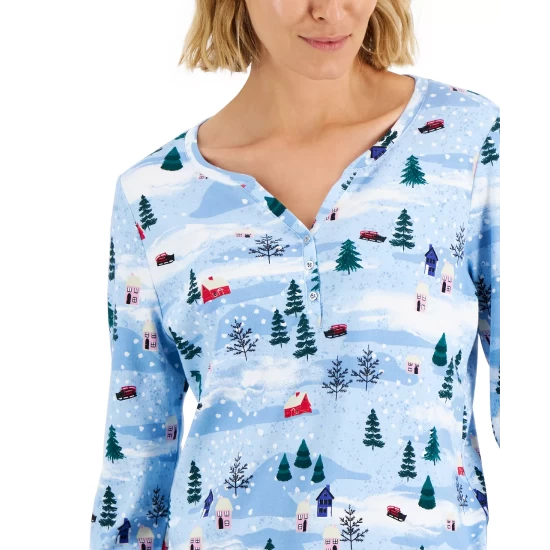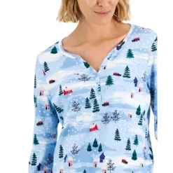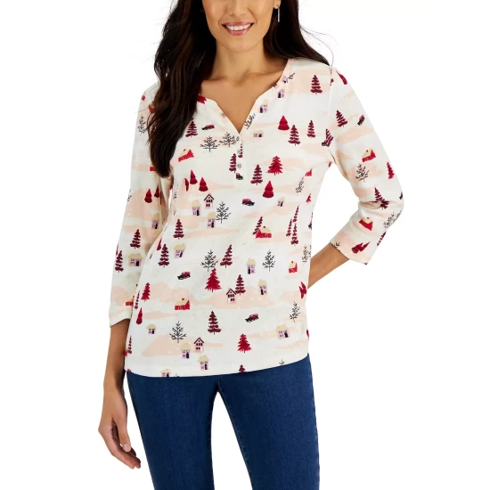 Karen Scott delivers a winter wardrobe essential with this 3/4-sleeve knit top styled with a henley neckline and holiday neighborhood print.