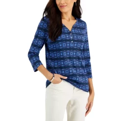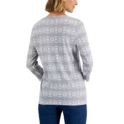 Karen Scott delivers a wardrobe essential with this Scandinavian inspired knit top styled with a henley neckline and 3/4-length sleeves.