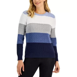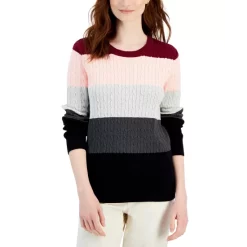 Karen Scott elevates the versatile cable-knit sweater with an allover monochromatic striped print, finished with ribbed cuffs and hem.