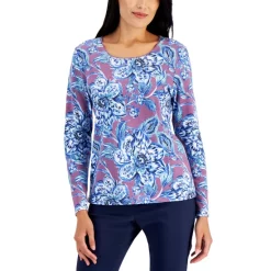 Oversize flowers in soft tones highlight a bold background, bringing fresh flair to this easy knit top from Karen Scott.