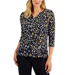 Go wild with Karen Scott’s leopard-print Henley top, styled with flattering 3/4-length sleeves.