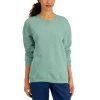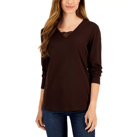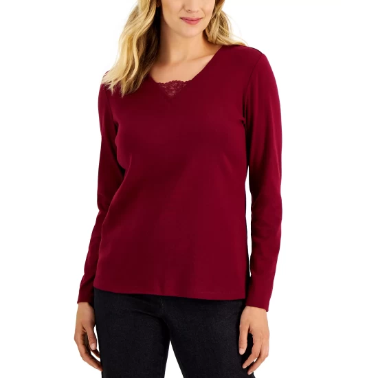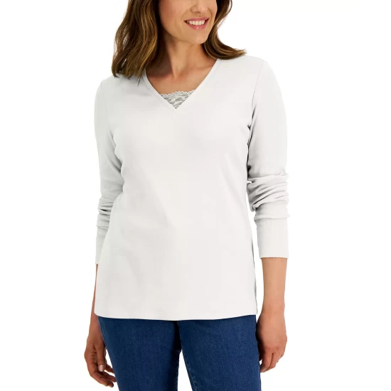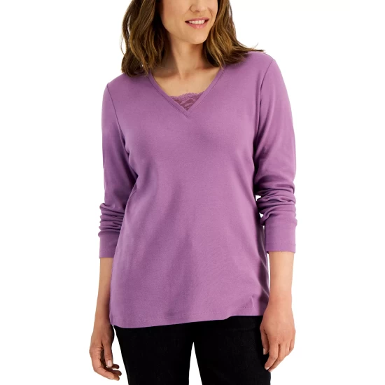 Karen Scott elevates the flattering V-neck with the charming addition of inset lace on this long sleeve top.