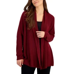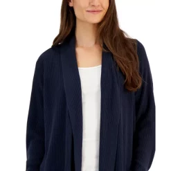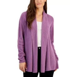 Rib-knit luxe soft yarn adds a cozy touch to this shawl-collar open cardigan from Karen Scott.