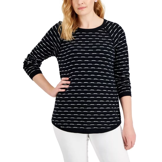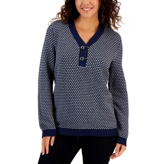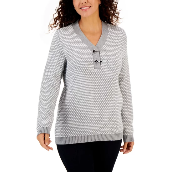 Hardware buckle details and an allover texture dress up this long-sleeve henley-style top from Karen Scott.