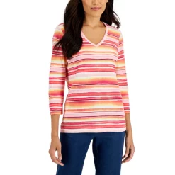 Add a calming vibe to your closet with this 3/4-sleeve top by Karen Scott, finished in a striped design that ripples as a view of the water would.
